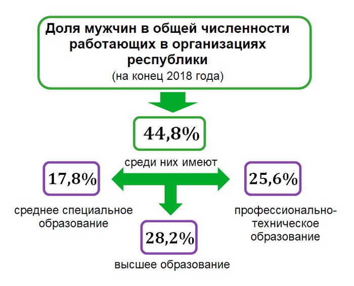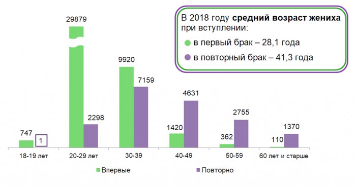 В 2018 году в брак вступило 60,7 тыс. мужчин. Впервые создали семьи 42,5 тыс. мужчин, повторно – 18,2 тыс. мужчин.