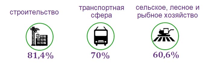 Сферы деятельности с наибольшей долей работающих мужчин (от общей численности работников организаций соответствующего вида экономической деятельности)