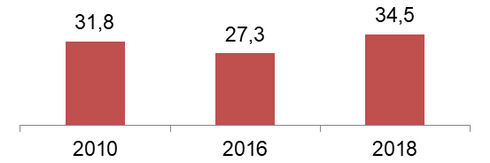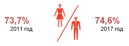 Образовательный уровень женщин выше, чем у мужчин. Среди занятых женщин 38% имеют высшее образование, 27% – среднее специальное (среди мужчин – 27% и 18% соответственно).