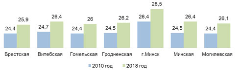 Средний возраст матери при рождении первого ребенка по областям и г.Минску (лет)