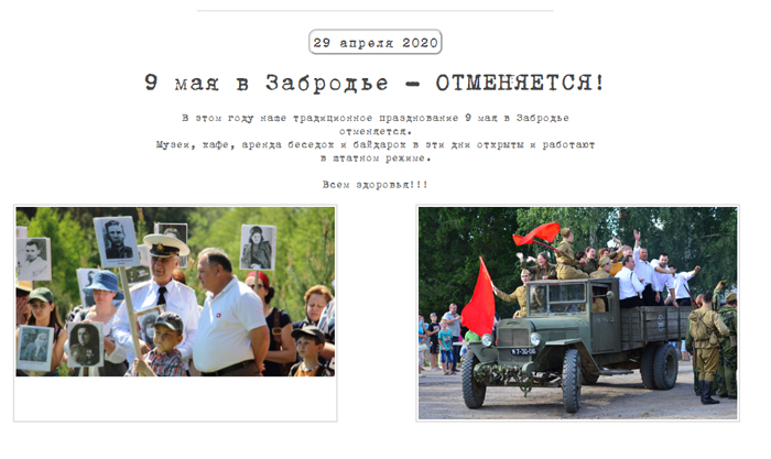 В этом году традиционное празднование 9 мая в Забродье отменяется. Об этом сообщается на официальном сайте музейно-усадебного комплекса в Забродье.