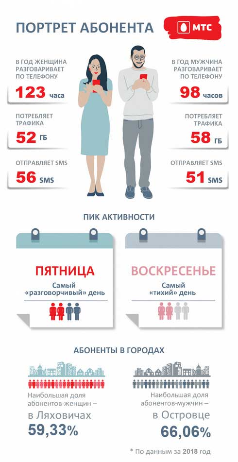 Активнее всего белорусы пользуются мобильной связью с понедельника по пятницу. В эти дни голосовой трафик расходуют около 80 % женщин и 76 % мужчин. Причем самый «разговорчивый» день — пятница, а «самый» тихий — воскресенье.