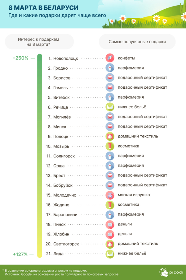 В результате обработки статистических данных выяснили, что самая большая заинтересованность восьмым марта – в Новополоцке, Гродно и Борисове. Именно в этих городах интерес к подаркам в праздничный период возрастает на 250%, 213% и 205% соответственно.