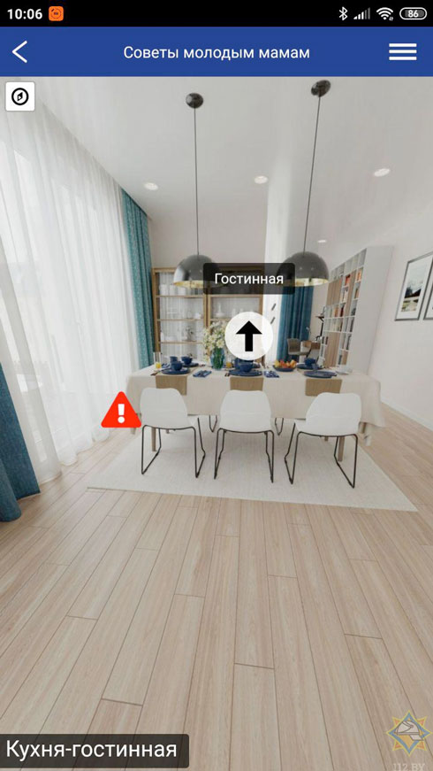 Проект создан в результате совместной работы представителей инициативы «Дети в безопасности» и МЧС Беларуси. Цель проекта – предупреждать несчастные случаи с детьми в быту, используя интерактивные средства. Раздел «Безопасность в квартире. 3D панорама» можно найти во вкладке приложения «Энциклопедия» – «Советы молодым родителям».