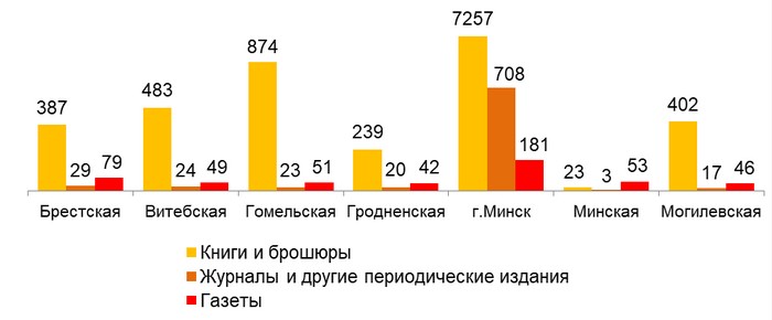 На русском языке в 2018 году издано 7,5 тыс. книг и брошюр общим тиражом 18,5 млн. экземпляров (72,3% от совокупного тиража), на белорусском языке выпущено 1323 книги и брошюры тиражом 4,3 млн. экземпляров (16,7%).