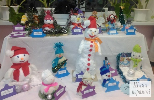 Выставка получилась очень индивидуальной и оригинальной. Задана лишь тема, а остальное – полет фантазий. Материал, исполнение, оформление композиций – и у каждого снеговика своё лицо. Здесь и забавные карапузы, и добродушные толстячки, и весьма стройные снежные бабы. Некоторые размером всего в несколько сантиметров, а рядом метровые фигуры. Из ниток, пенопласта, макарон, дерева, бумажных стаканчиков…