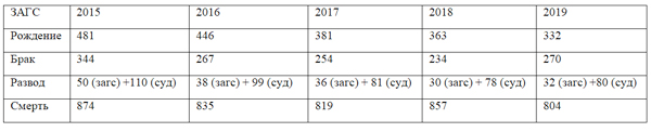 – В 2019 году зарегистрировано 804 смерти (по городу – 416, район – 388). Из них 373 мужчин и 431 женщина. Средний возраст умерших мужчин – 66 лет, женщин – 79 лет. Пенсионеров умерло 713 человек, людей трудоспособного возраста – 134. Также составлены 15 записей актов о смерти в отношении иностранных граждан.
