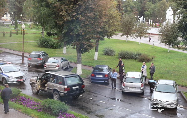 Судя по фотографии, «Рено», выезжая с парковки, не уступил дорогу автомобилю, который двигался в направлении райисполкома. В результате происшествия у «Рено» имеются механические повреждения правой передней фары.