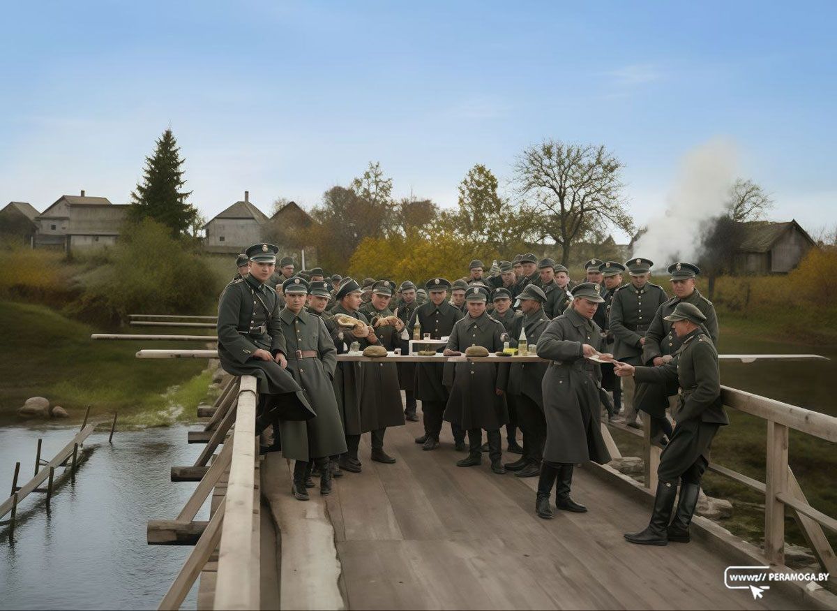 За ўсю гісторыю нашага горада мастоў праз Вілію было шмат, але зараз нас цікавіць той, які выяўлены на гэтым фотаздымку. На ім мы можам пабачыць жаўнераў польскага палка Корпусу Аховы Памежжа “Вілейка”, якія, падобна, нешта святкуюць. На дошках, якія пакладзены праз мост як сталы, стаяць і пляшкі з гарэлкай, і хлеб, і сала, і агуркі. А на заднім фоне відаць хаты і гаспадарчыя пабудовы. Цяпер на месцы гэтых хат знаходзіцца вуліца Стаўкі. Гэты драўляны мост быў спалены 24 чэрвеня 1941 года, калі савецкія войскі пакідалі Вілейку.