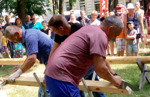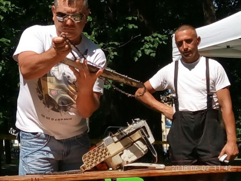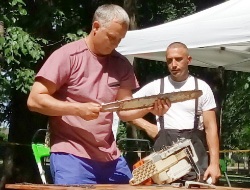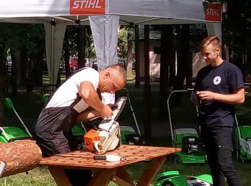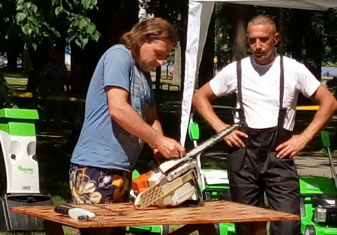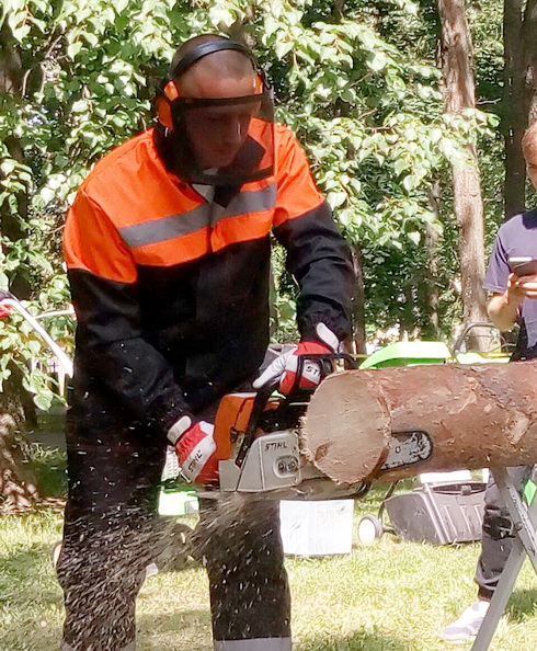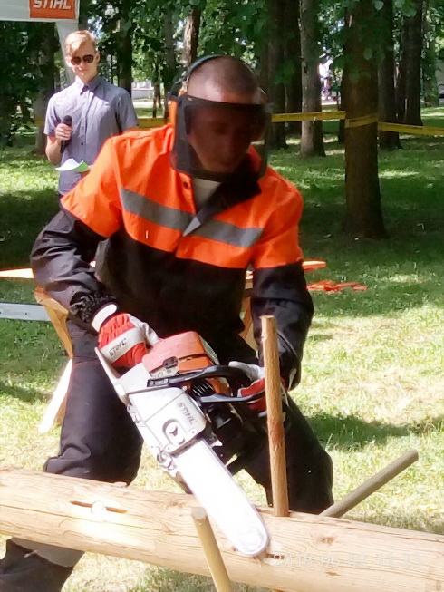После демонстрации прошло показательное выступление вилейского мастера по валке леса среди юниоров Евгения Косака. На площадке Евгений на время разбирал, как армейский автомат, бензопилу с заменой цепи. Далее, точно и быстро выполнил раскряжевку ствола дерева. Зрелищным и очень захватывающим было для вилейчан и выступление по обрезке сучьев.
