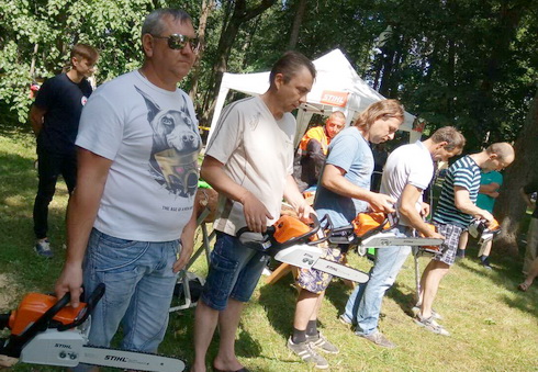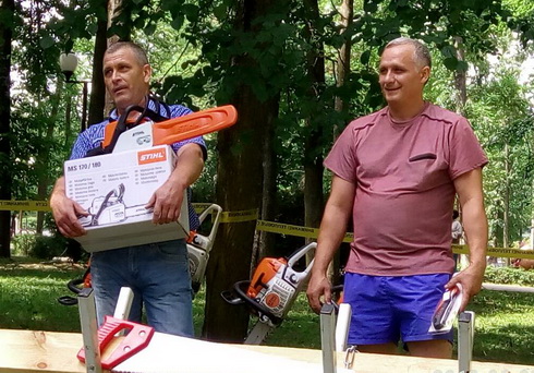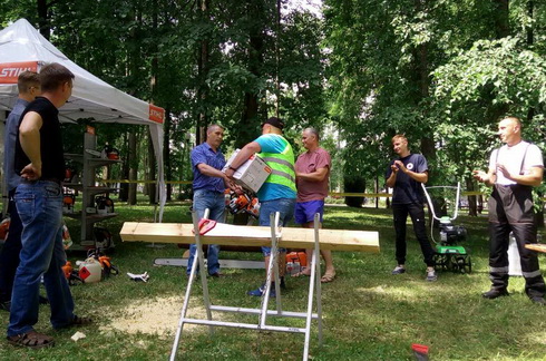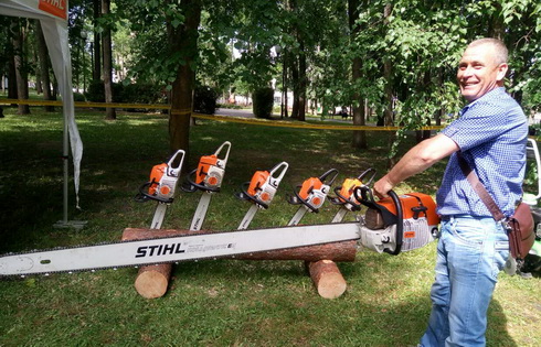 Посоревноваться между собой на главный приз – бензопила «STIHL MS 180», вызвалось восемь смельчаков. По условию конкурса мужчины на вытянутой руке держали бензопилу, выполняли на время демонтаж-монтаж цепи и раскряжёвку ствола. В результате, победителем стал вилейчанин Владимир Сак, которому торжественно была вручена бензопила.