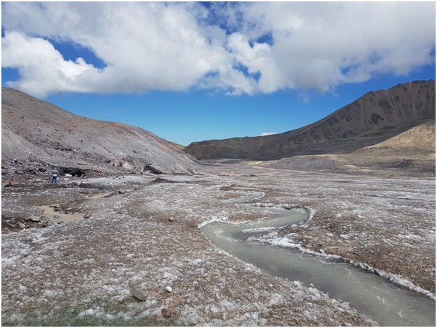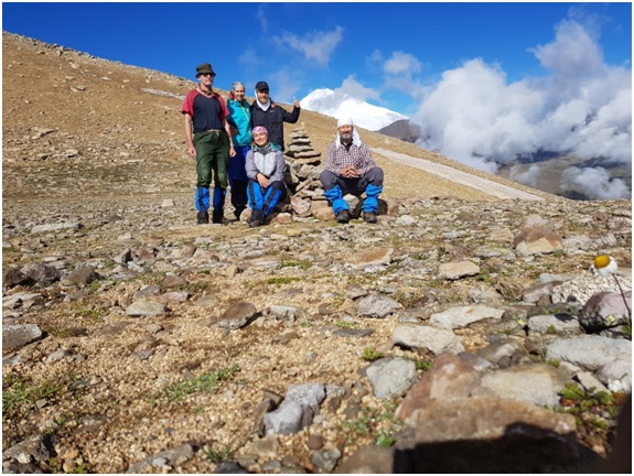 Наша цель на сегодня – восхитительное горное озеро Сылтранкель. Цвет воды в озере менялся в течение дня от сине-зеленого до коричневого, в зависимости от освещения, облака то наступали, то рассеивались. Озеро окружено вершинами примерно в 4000 м, на них местами лежит снег. У подножия озера, куда спускается ручей с гор, нерастаявший лед, а рядышком расположился сотканный самыми искусными мастерами-кудесниками цветочный ковер.