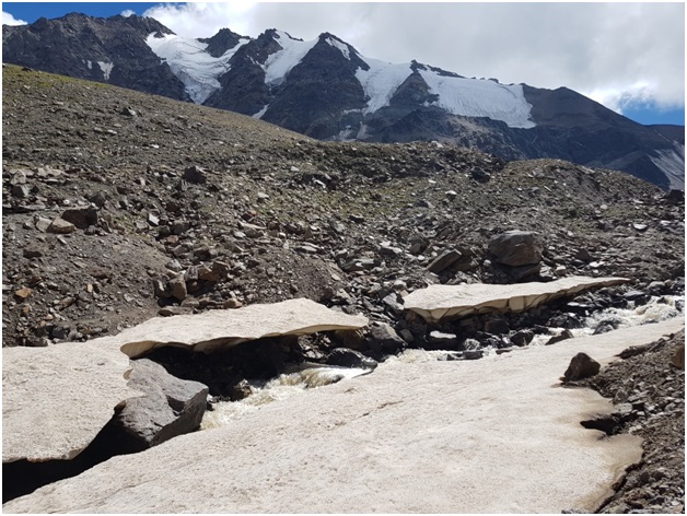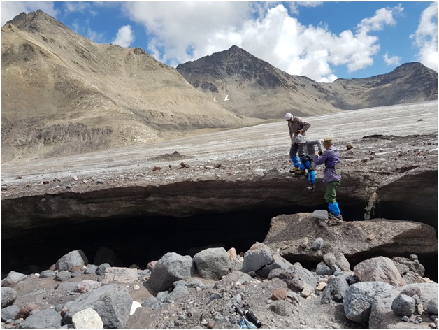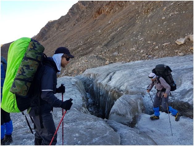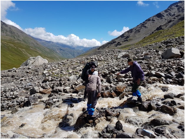 У одного из участников сломалась кошка. А без кошки в нашем походе никуда. Шпагат временно спас ситуацию. Без дальновидности и сноровки в походе не обойтись! Снежно-ледовое поле, конечно, прекрасное, но нам с него надо было выйти, а выход не просматривался, так как по всему его краю текла бурная грязная река. Там все бурлило и кипело, и не было видно переправы. К счастью, через несколько часов мы ее нашли. При виде переправы сердце немного чаще забилось, хотя на деле все оказалось не так уж и страшно. Нужно было всего-то спрыгнуть на кусок отвалившегося ледового карниза рядом с бурлящей рекой. Выход найден, и мы все ближе к Эльбрусу, до которого нам еще два дня хода.