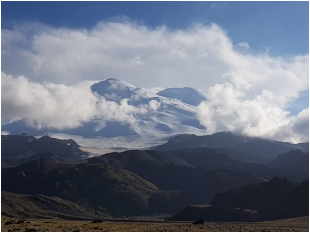 Рано утром мы уже были на перевале. Перед нами открылся живописнейший вид на красавца Эльбрус и снежно-ледовое поле Джикаугенкез. Душа пела.