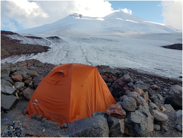Пора ставить палатку. Колышки вбить там невозможно, поэтому вся палатка крепится только камнями. Причем камни следует выбирать побольше, чтобы не сдуло ветром. Пока ставили палатку, появилась отдышка, все-таки высота 3800. Лагерь готов, можно отдышаться и полюбоваться Эльбрусом. Он величественный. Возвышается и смотрит на нас, весь в своих мыслях, мы о них даже не догадываемся.