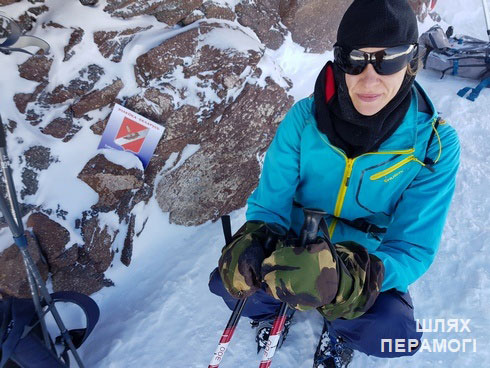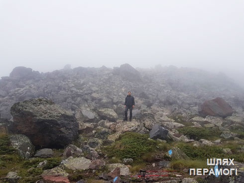 За сто метров высоты до вершины мы подошли к большому камню в надежде спрятаться от ветра. К моему огромному удивлению там была табличка с гербом Вилейки. Вот так молодцы вилейчане! Эта табличка придала мне сил и согрела душу. Мысленно порадовалась за земляков.