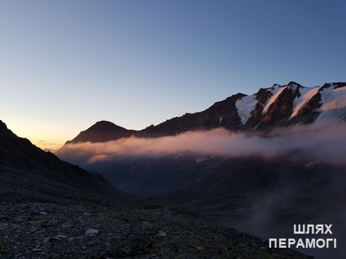 19 августа. Восхождение. Звонит будильник ровно в полночь. За палаткой слышен голос руководителя, что ждем часа ночи. Это значит, что еще час можно отдохнуть. Внутри даже стало немного легче оттого, что выход оттягивается. Еще час провалялись в полудреме. В час звучит твердый голос руководителя: «Собирайтесь. Выходим». Два слова: от них внутри все взбудоражено, а снаружи сдержанность. Кошки надеты, крепление проверено, выходим в путь. Зону трещин проходим в связках. Постепенно начинает светать. Глядя на красоту кругом, забывается и холод, и усталость.