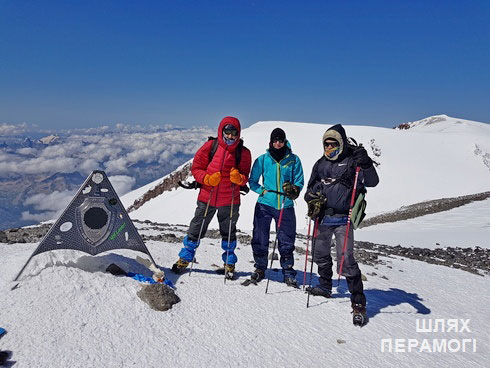 Последний рывок, и мы достигли цели! На вершине дул очень сильный ветер. Конечно, виды открываются восхитительные. Видны снежные и скалистые горы вперемешку с облаками. Получается очень привлекательный десерт: Эльбрусская вершина, пропитанная облаками под лазурным небом. Ммм, прямо объедение для души!