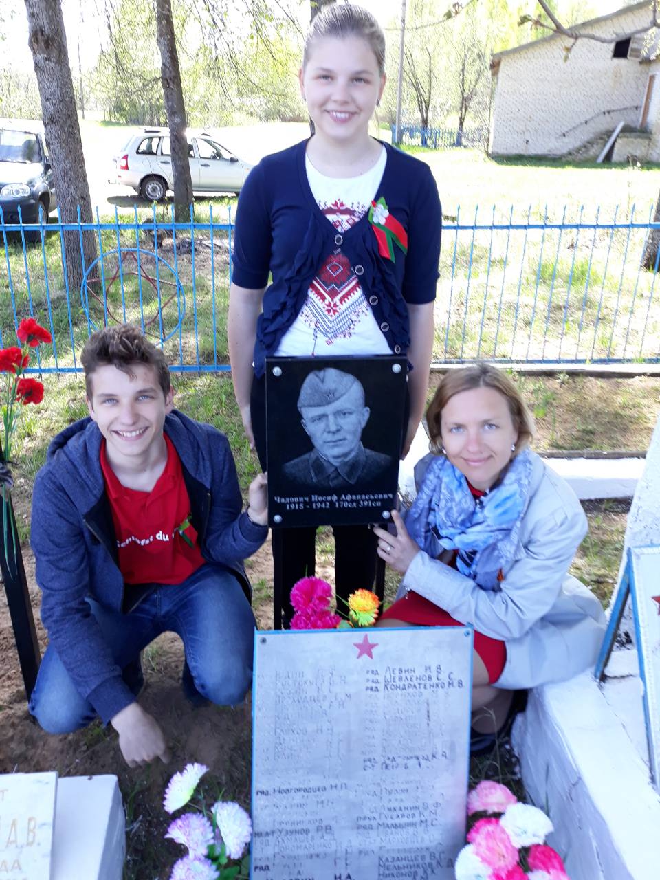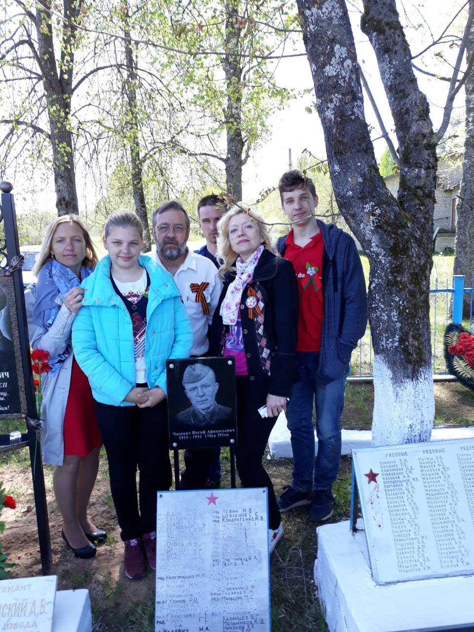 — Этот 9 мая для меня и моей семьи поистине знаковый день, — поделилась с нами Ольга Шляпо, — ведь мы, спустя практически восемь десятков лет, смогли посетить место гибели и упокоения нашего дедушки Иосифа Чадовича, о судьбе которого до этого времени мало что знали. Нам было известно только то, что дед родился в поселке Кожевниково в Сибири в 1915 году, сразу после переселения его родителей из Беларуси из деревни под Солигорском. В то время была такая политика: беларусам обещали много земель в Сибири. Последние годы мы делали запросы во многие архивы и учреждения и вот, по архивным справкам, мой брат Владимир установил, что наш дед погиб на поле боя, где и похоронен — в деревне Васильевщина Старорусского района Новгородской области России. Мой отец вспоминал, что после войны к ним в деревню приходил сослуживец деда, который рассказывал, что дед был корректировщиком огня. В день гибели он вышел на передовой край обороны, а немцы обнаружили его позиции и уничтожили. Чтобы доехать до места, где погиб мой дед, мы преодолели 720 километров только в одну сторону и посетили памятное место, где находится братское захоронение воинов, погибших в те страшные годы ожесточенных боёв Великой Отечественной. На мемориале братского захоронения в д. Василевшина в прошлом году была выгравирована фамилия Иосифа Чадовича в общем списке погибших, а по приезду мы здесь установили и мемориальную плиту с фотографией и годами жизни деда.