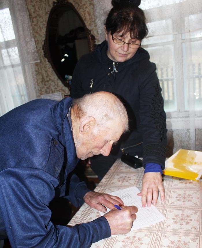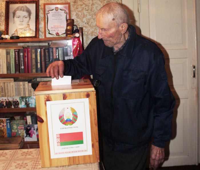 В Кузьмичах члены избирательной комиссии первыми приходят к Михаилу Квяткевичу. Ветеран Великой Отечественной войны: партизанил в лесах Вилейщины, участвовал в боях за Кёнигсберг, победу встретил на Одере. Почётный ветеран Вилейского района. Ему 96-лет. При этом Михаил Иванович в добром здравии, «только вот ноги болят». Выписывает и читает нашу газету, с программами кандидатов в депутаты познакомился, выбор свой сделал.