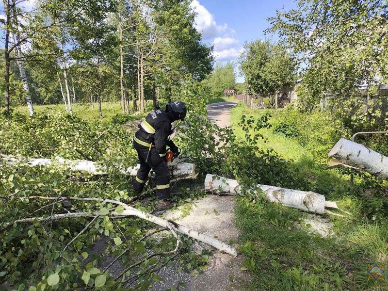 «Вследствие прохождения сильного ветра зафиксировано 10 случаев падения деревьев в 5 районах области: Березинском, Борисовском (3), Крупском, Минском (3), Солигорском (2). Упавшим деревом в г. Борисов повреждены 2 легковых автомобиля», – говорится в сообщении.