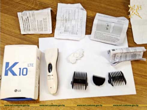 Почтовое отправление поступило из Израиля в адрес 36-летнего жителя г. Минска. В посылке находилась коробка из-под мобильного телефона с б/у мужской машинкой для стрижки, насадками к ней и инструкцией. Крышка на приборе, под которой должны находиться батареи, не была закреплена болтами. А под ней вместо батареи находился сверток из фольгированной бумаги, внутри которого — прозрачный пакет с неизвестным порошкообразным веществом белого цвета. Вещество таможенники направили на экспертизу.