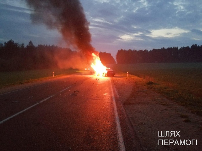 Жуткое лобовое столкновение произошло вблизи Вилейки. От удара один из автомобилей загорелся