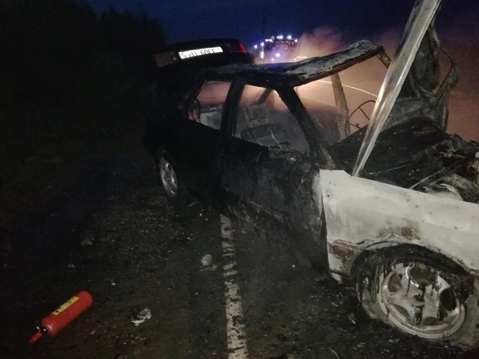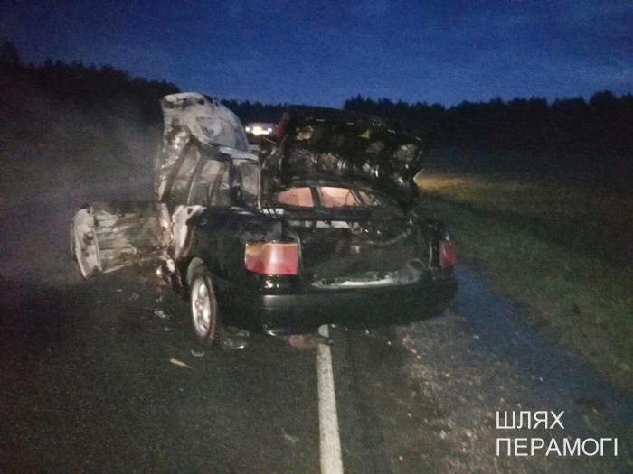 От удара автомобиль «Ауди» загорелся. Для тушения пожара понадобилась помощь МЧС, которые оперативно потушили огонь.