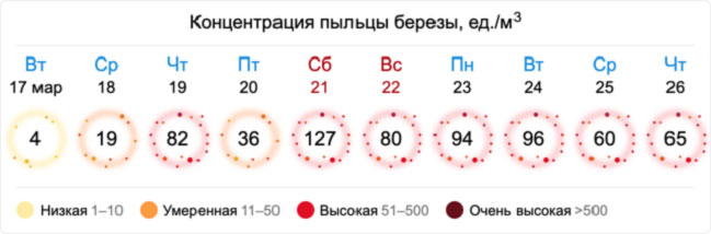 Пока прогноз доступен только по концентрации пыльцы березы — одному из самых распространенных аллергенов.
