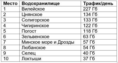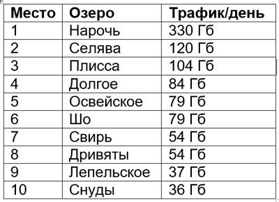 В десятку самых «качающих» озер вошли крупные курортные зоны и менее известные, но активно посещаемые места. Вверху этого списка разместилось Нарочь с 330 Гб интернет-трафика в день. Также в топ-3 оказались озера Селява и Плисса.