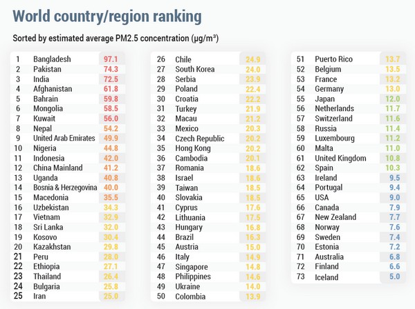 В пятерку лидеров попали Исландия, Финляндия, Австралия, Эстония и Швеция . Воздух в них признали самым чистым.  Критические показатели отмечаются в Индии, Пакистане и Бангладеше.