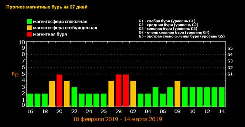 Согласно прогнозу, магнитные возмущения начнутся с 19 февраля и продлятся три дня. Пик прогнозируется на 20 число. В этот день вероятны магнитные бури 5 баллов (уровень G1).