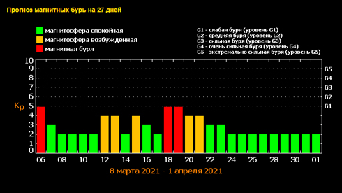 По прогнозам ученых, пик магнитной бури начнется примерно в три часа ночи и продлится до 6 утра. На стадии спада возмущения будут находиться до 9 утра, однако спокойствие атмосферы будет недолгим. Небольшие магнитные всплески ожидаются 12, 13, 15, 20 и 21 марта. Также вспышки накроют Землю 18-19 марта – уровень G1.