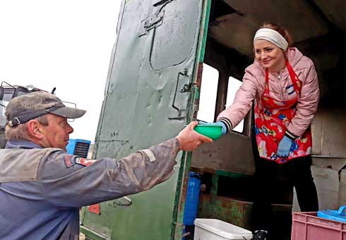 Пока мы беседовали с механизаторами, подоспела полевая кухня. Вкусными обедами угощала аграриев симпатичная девушка Екатерина Кулаковская. Это ее первое рабочее место. Екатерина нам рассказала, что блюда вкусные, повара стараются готовить разнообразное меню. И работа ей эта нравится, выезжает в поле с удовольствием, чтобы накормить мужчин горячими обедами.