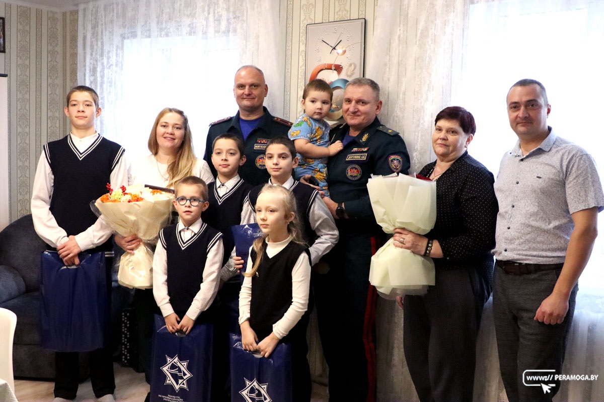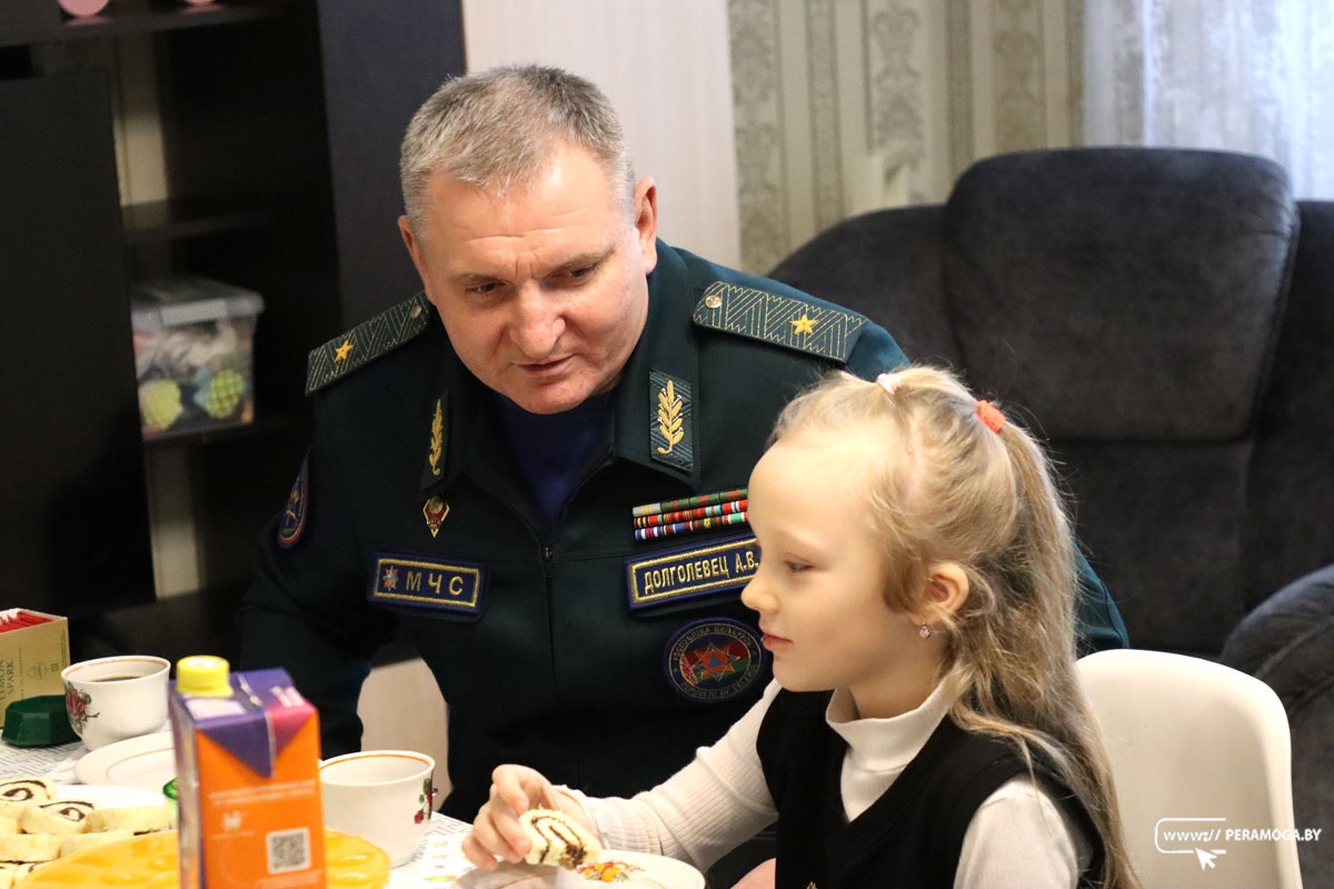 В доме многодетной семьи Лешкович из агрогородка Долгиново 3 декабря царила особая, душевная атмосфера. К ним в гости приехали заместитель министра по чрезвычайным ситуациям Анатолий Долголевец и заместитель начальника Минского областного управления МЧС Валерий Войтехович.