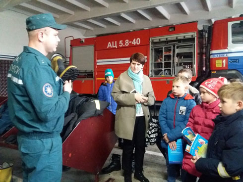 А затем Евгений Каркоцкий, командир отделения ПАСЧ №1 г.Вилейки Вилейского РОЧС провёл для ребят экскурсию по пожарной части, рассказал ребятам о том, какую работу выполняют пожарные-спасатели, рассказал о машинах, которые помогают пожарным при тушении пожаров и при спасении людей. В ходе беседы ребята задавали вопросы, а также активно отвечали на вопросы Евгения Сергеевича. Экскурсия получилась очень познавательной и полезной для ребят. В конце встречи все ребята получили подарки и брошюры по правилам пожарной безопасности в различных ситуациях.