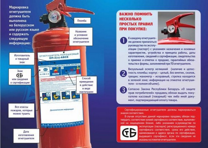 Маркировка огнетушителя должна быть выполнена на русском или белорусском языке и содержать следующую информацию: изготовитель и товарный знак; знак или сведения о сертификации; пломбу; название и условное обозначение огнетушителя; способ приведения в действие в виде пиктограмм; все классы пожаров, которые можно тушить; дата изготовления.
