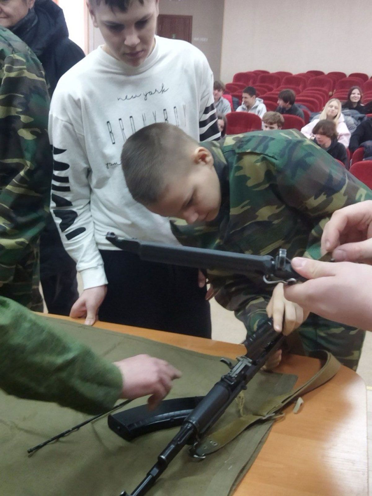 Кульминацией экскурсии стал показ стрелкового оружия. Военнослужащие подробно рассказали о характеристиках автомата Калашникова, все желающие смогли попробовать свои силы в его неполной разборке и сборке.