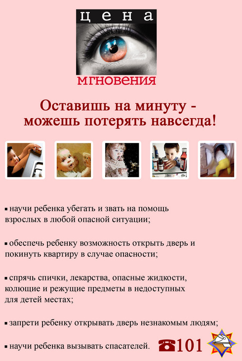 И самое главное, ни под каким предлогом не оставлять детей одних, даже если Вы собрались выйти всего на одну минуту. Ведь именно эта минута может стоить вашему ребенку жизни. Не будьте равнодушными и безразличными к неблагополучным семьям, проживающим по соседству, ведь там тоже воспитываются дети.