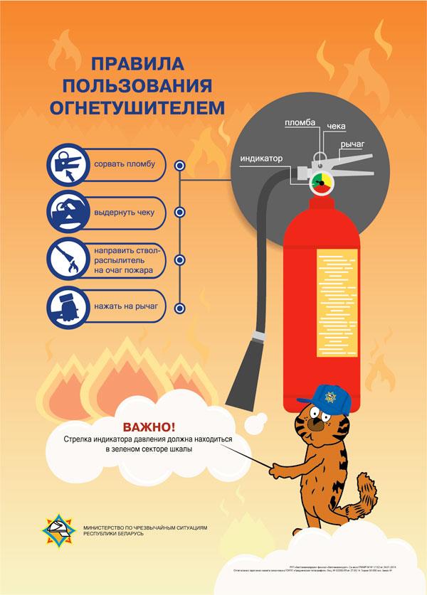 Перед применением обязательно ознакомьтесь с инструкцией, расположенной на баллоне. Современным огнетушителем пользоваться совсем несложно. Необходимо взять его в руки, сорвать пломбу и выдернуть чеку. Далее направить раструб в сторону очага возгорания, нажать на рычаг огнетушителя и приступить к тушению. Если справиться с возгоранием не удалось, необходимо покинуть горящее помещение и вызвать спасателей по номеру 101 или 112.