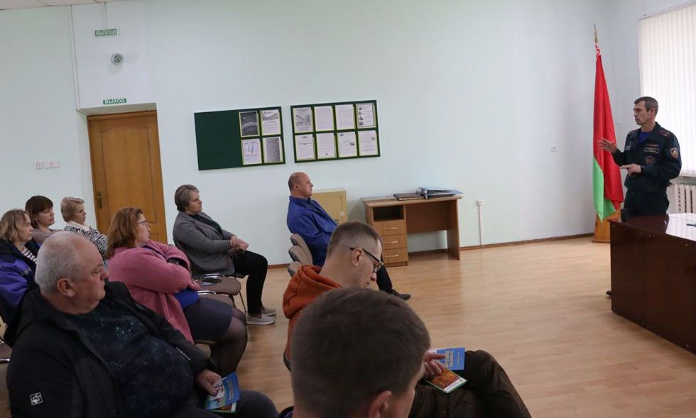 Заключительным этапом было выступление в трудовом коллективе. Начальник Вилейского районного отдела по чрезвычайным ситуациям проинформировал собравшихся о ситуации с пожарами и другими ЧС, произошедшими на территории Минской области и Вилейского района, подробно рассказано про действия при получении различных сигналов гражданской обороны.