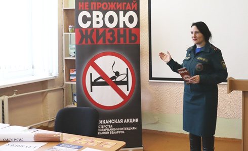С ребятами блиц-опрос “А вы знаете, что курение…” провела инспектор сектора пропаганды и взаимодействия с общественностью районного отдела по чрезвычайным ситуациям Надежда Литвинович, также рассказала о вреде курения и акции “Не прожигай свою жизнь!”.