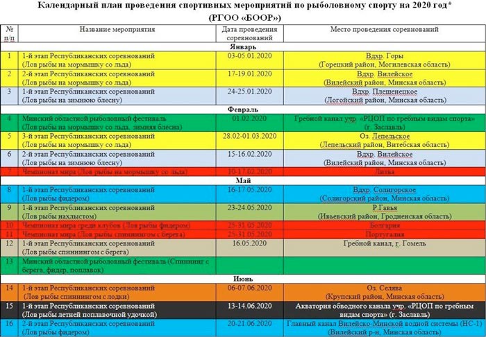 Определены даты и места проведения Республиканских соревнований по различным дисциплинам рыболовного спорта в 2020 году, сообщили в РГОО «Белорусское общество охотников и рыболовов».