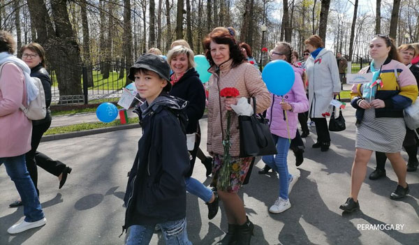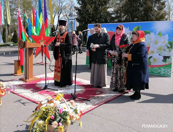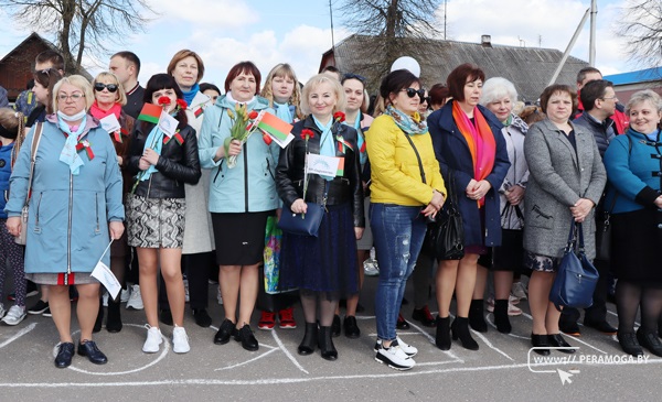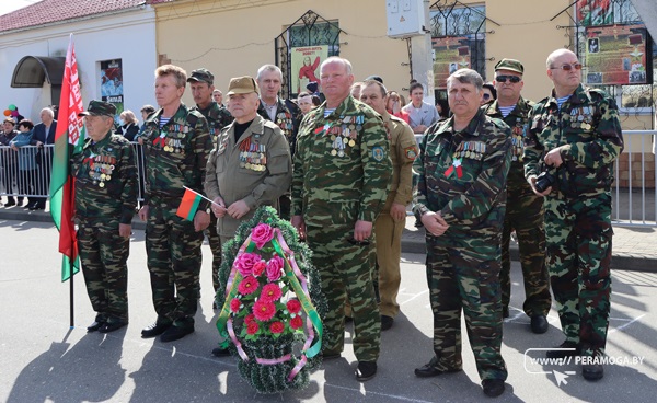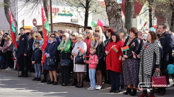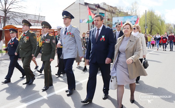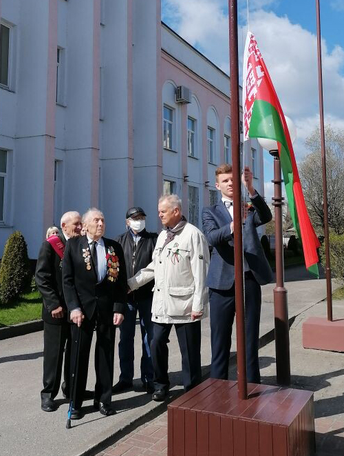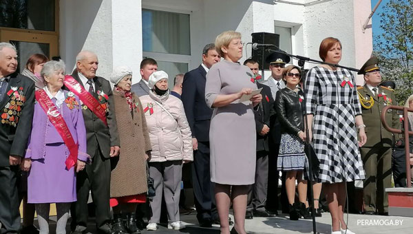 Во второе воскресенье мая в Беларуси отмечается День Государственного герба Республики Беларусь и Государственного флага Республики Беларусь – в этом году этот праздник выпал на 9 мая: встретились две важные для страны даты. Поэтому мероприятия в этот день начались торжественным митингом в честь главных символов суверенности нашей страны. У Доски почёта Вилейского района собрались руководство района, представители отделов и служб райисполкома, трудовых коллективов, общественных организаций, ветераны и несовершеннолетние узники фашистских концлагерей, воины-интернационалисты, моряки радиостанции «Антей» ВМФ России. Их приветствовала председатель районного Совета депутатов Елена Чеботарь.
