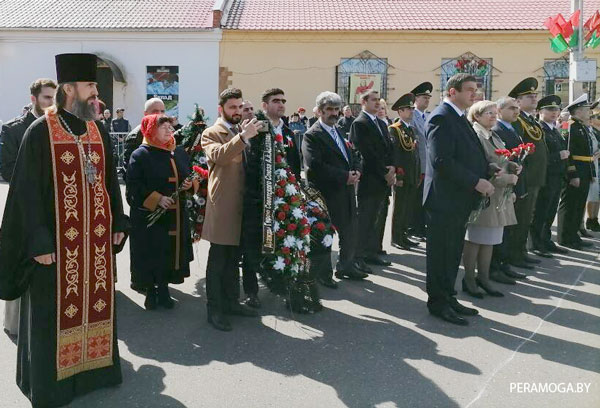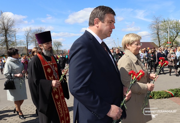 В низком поклоне его участники склонили головы перед ветеранами Великой Отечественной войны, узниками концентрационных лагерей, тружениками тыла. В знак благодарности юноши и девушки, выросшие в мирное время, исполнили «Вальс Победы». В память о войне, её жертвах и подвиге народа, защищавшего свою родину от врага, легла к мемориалу воинам-освободителям города гирлянда из еловых веток. Поминальную литию в память о погибших воинах совершил Благочинный церквей Вилейского округа протоиерей Вячеслав Вабищевич.