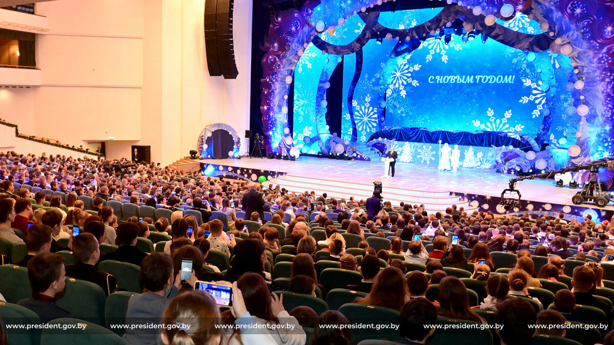 «От всего сердца еще раз поздравляю всех вас, маленьких и уже взрослых — будущее нашей Беларуси, ваших педагогов, воспитателей, учителей, ваших родителей с Новым годом! Я желаю вам отличного настроения, крепкого здоровья и, самое главное, успехов в учебе. Учеба для вас — главнейшая задача на этом этапе вашей жизни. А сейчас с большим удовольствием уступаю эту сцену нашим хозяевам — Деду Морозу и Снегурочке», — сказал белорусский лидер.