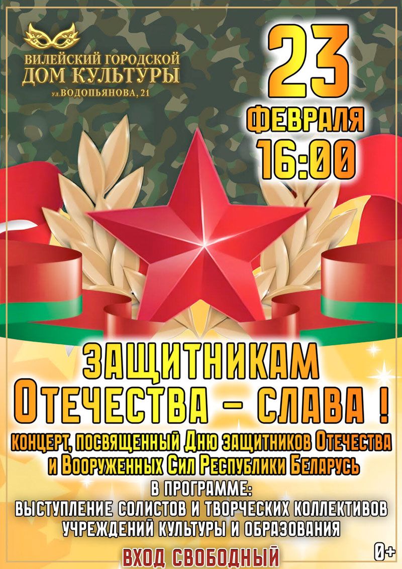 23 февраля в Вилейском городском Доме культуры пройдет праздничный концерт ко Дню защитников Отечества и Вооруженных Сил Республики Беларусь.