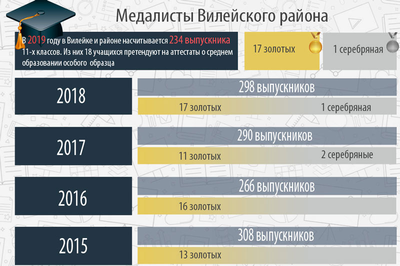 В отделе образования Вилейского райисполкома рассказали, что всего в этом году в Вилейке и районе насчитывается 234 выпускника 11-х классов. Как и в прошлом году, 18 учащихся претендуют на аттестаты о среднем образовании особого образца (17 учеников на золотую медаль и 1 – на серебряную).