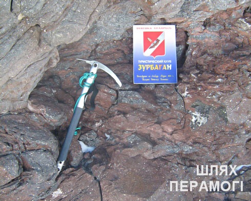 На вершине мы провели около получаса. Сфотографировались с баннером-логотипом «Зурбагана» возле конуса, символизирующего пик горы. Вымпел-знак турклуба, на котором написано «Восхождение в память Виталия Костенко» – мы оставили на вершине. И –вниз.