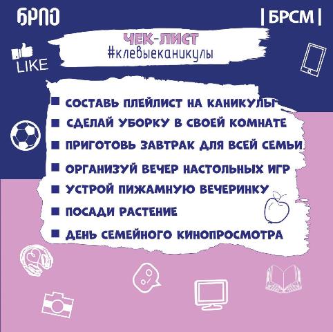По ее словам, уже стал известен чек-лист заданий проекта. «Так, сегодня ребята составляют play-лист на все каникулы. Им также предстоит подобрать фильмы для семейного просмотра. Организаторы подготовят и свои музыкальные рекомендации и подборку интересных картин со ссылками, где их можно посмотреть. В числе заданий на каникулы — сделать уборку в своей комнате, приготовить завтрак для всей семьи, организовать вечер настольных игр, устроить пижамную вечеринку и посадить растение. Ребята, которые выполнят все задания, получат подарки от БРСМ и БРПО», — отметила секретарь ЦК БРСМ.